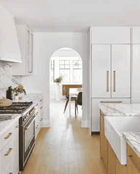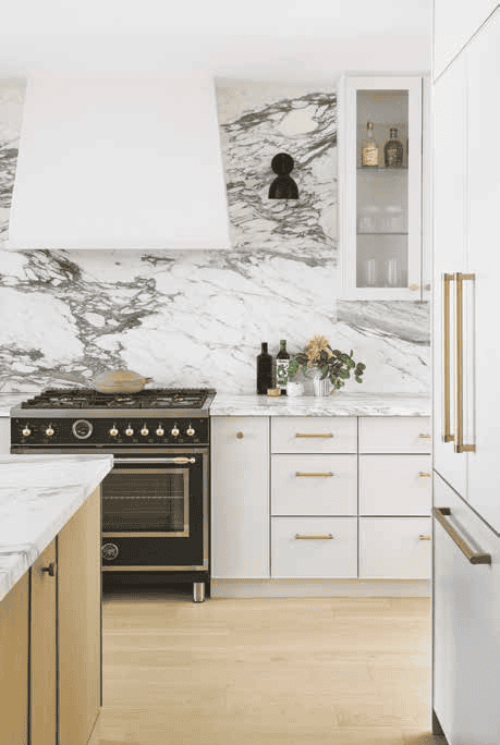 To maintain a sense of balance, tall millwork elements like the fridge and pantry were grouped together, each concealed behind custom panels for a streamlined look. The kitchen’s statement Corchia marble—used for both the island countertop and backsplash—adds a touch of luxury with its creamy white base and striking gray and taupe veining. “It’s the real showstopper,” says Fant. “The movement in the stone brings so much character.”