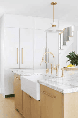 One of the kitchen’s standout features is its unexpected square island. “Most islands are rectangular, but given the unique shape of the space, a square layout maximized functionality,” Fant explains. “It gives us three sides of usable cabinetry, which the homeowners love.” The cabinetry itself balances modern minimalism with timeless appeal, featuring a slim 1/4” shaker profile finished in Benjamin Moore’s Balboa Mist. A natural white oak island ties in seamlessly with the hardwood floors, lending warmth to the space.